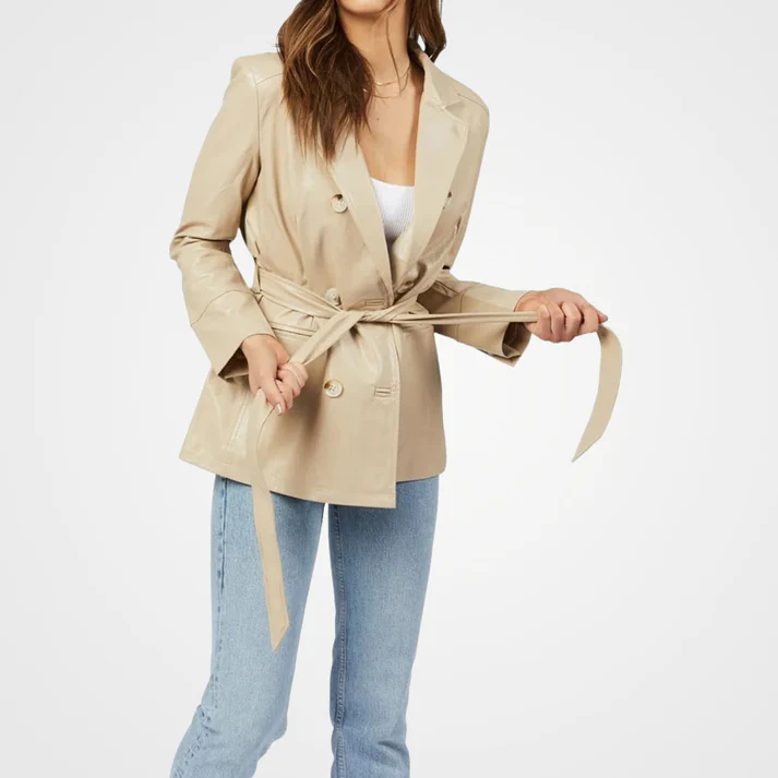 There is more to the Women’s Beige Double-Breasted Leather Coat than a simple outer garment: the coat is a classic piece that will only get better with age. The quality leather gets better with age, and you could wear it again and again without tiring of it as time goes by.